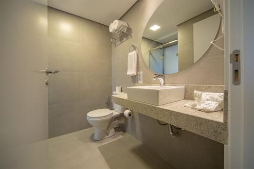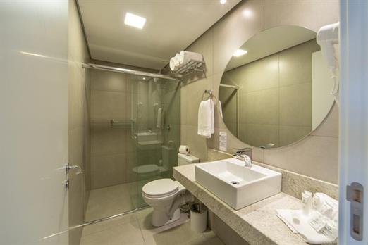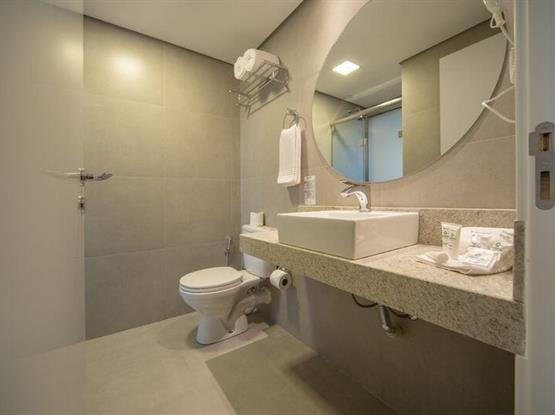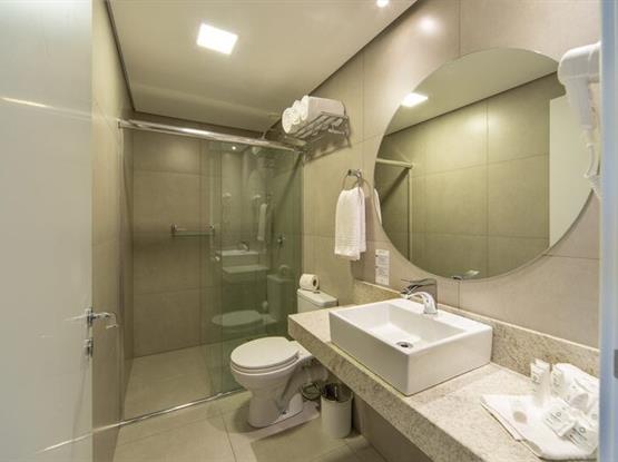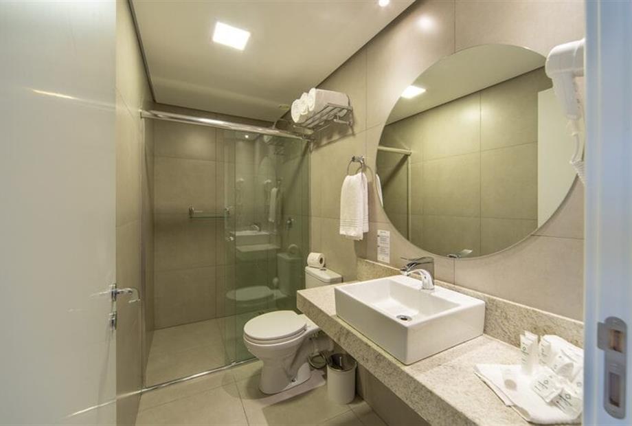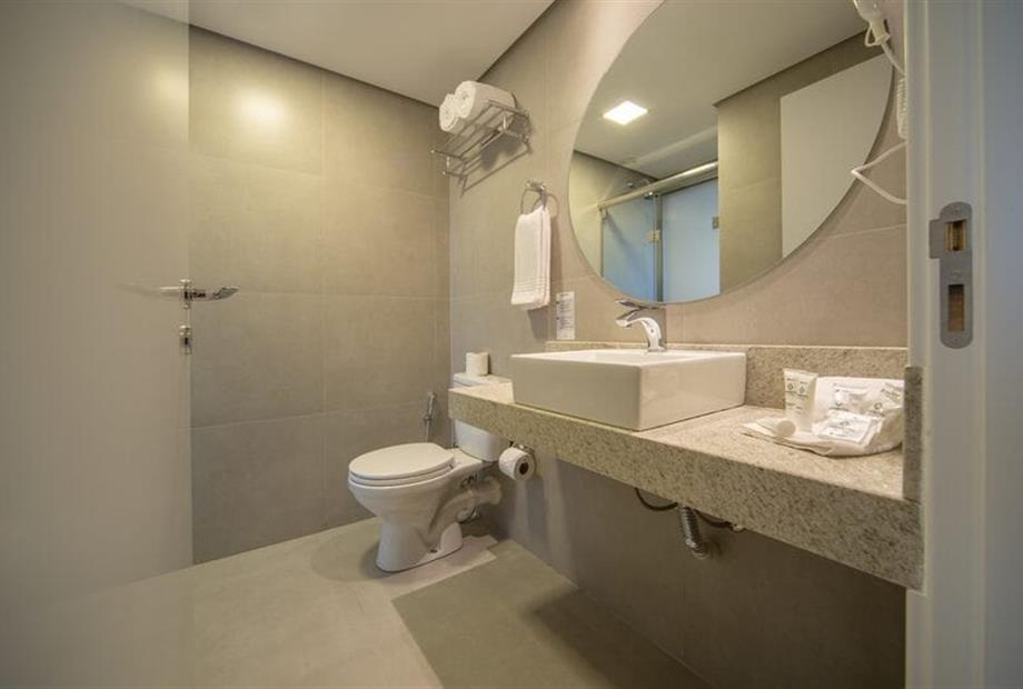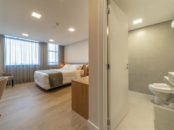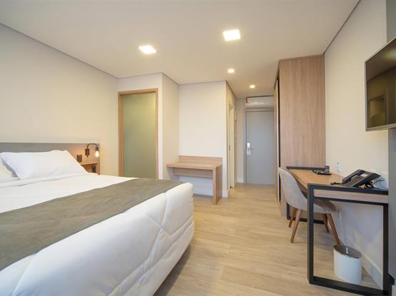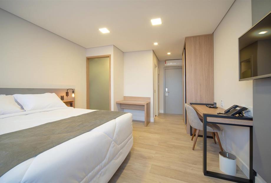 Ar condicionado | Frigobar | Cama Box Casal | Cofre | Tv por assinatura | Piso Laminado | Secador de Cabelo | Amenidades | Aprox. 20m²